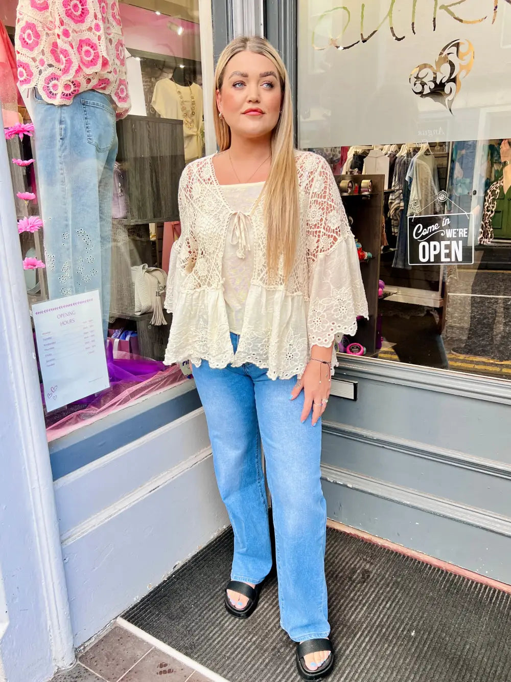 This versatile cardigan is the perfect layering piece for any outfit. The crochet knit provides unparalleled softness and warmth in the chillier evenings, while the tie front allows you to customize the fit. The scalloped embroidered details add a touch of feminine elegance.