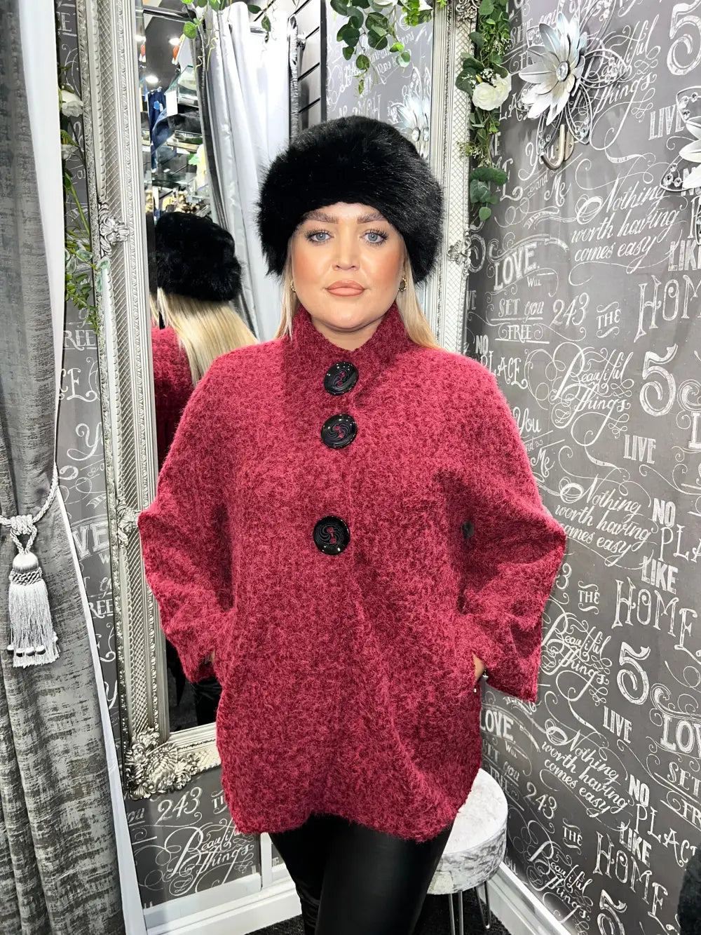 KATRINA LARGE BUTTON BOUCLE COAT - WINE
