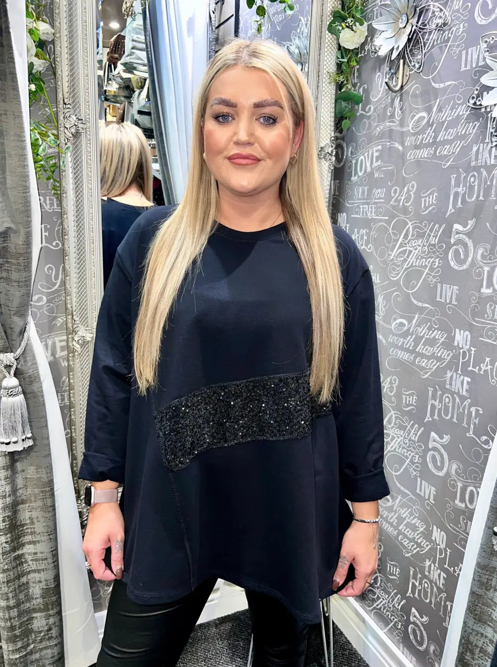 Introducing our exquisite Sequin Panel Top, a perfect blend of comfort and luxury. Crafted from a sumptuous sweatshirt material, this top features a soft fleece inner that envelops you in warmth and softness. The stylish dipped hem at the back adds an elegant touch, while intricate stitch detailing along the front enhances its sophisticated design.