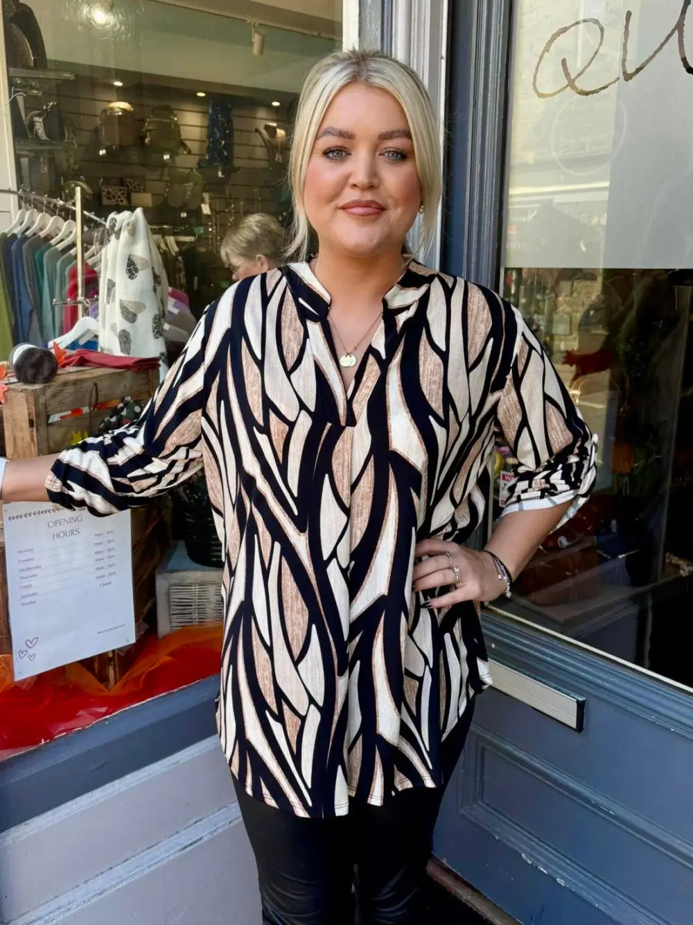 Elevate your wardrobe with the Naomi Abstract Design Top, an exquisite piece that seamlessly marries sophistication and convenience. Crafted with a long-length silhouette, this top features a stylish v-neck that gracefully frames the face, while the delicate small pleat at the front adds an element of refined elegance.