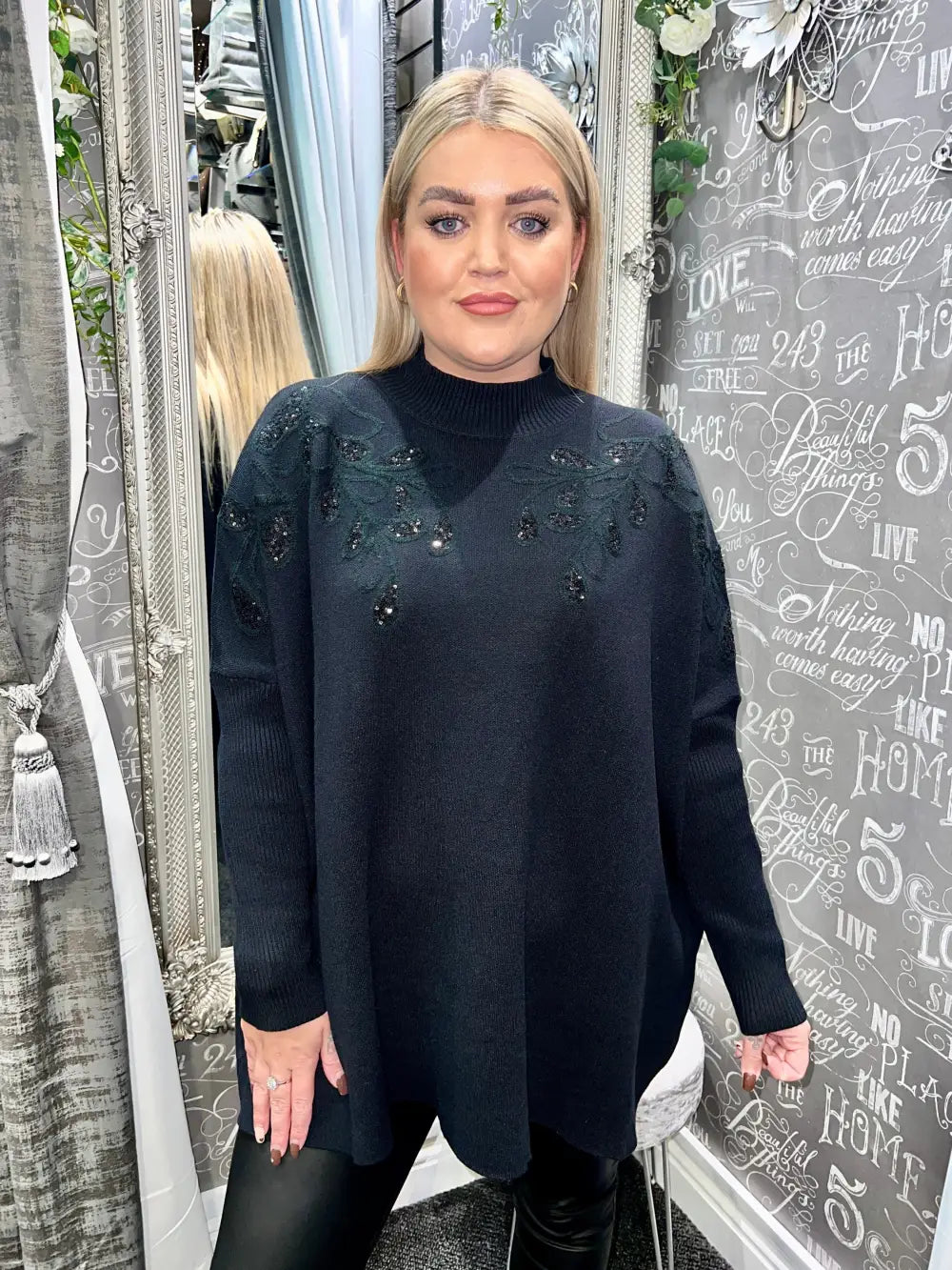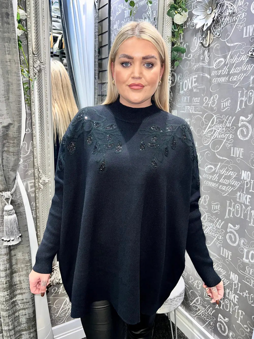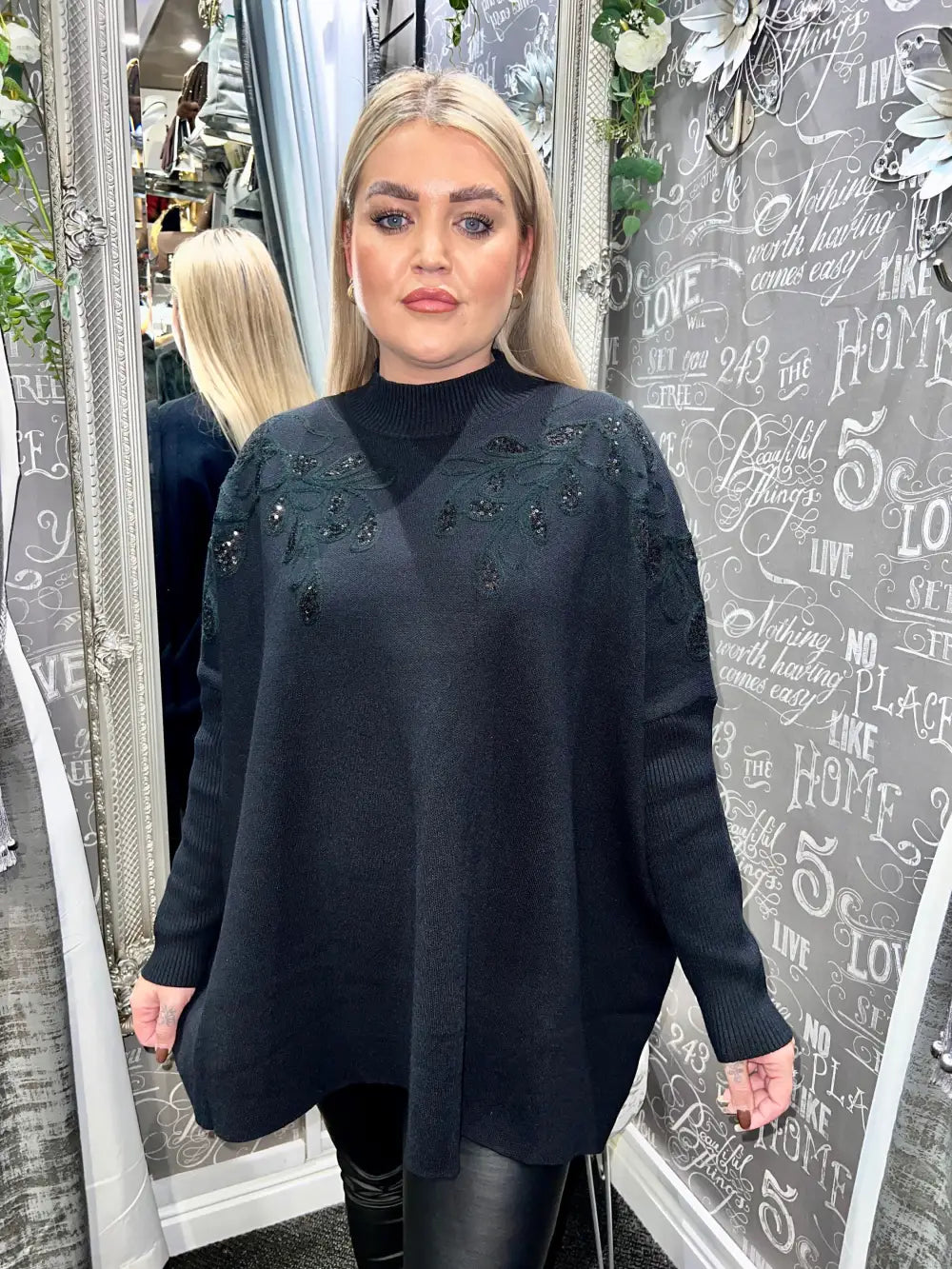 Elevate your wardrobe with the exquisite Staci Sequin Leaf Design Jumper. Crafted for those who appreciate luxury and sophistication, this stunning piece features a high neck that elegantly frames the face, while the embroidered leaf design adorned with self-coloured sequins adds a touch of opulence to your ensemble. The batwing sleeves enhance the fluidity of movement, ensuring comfort without compromising style.