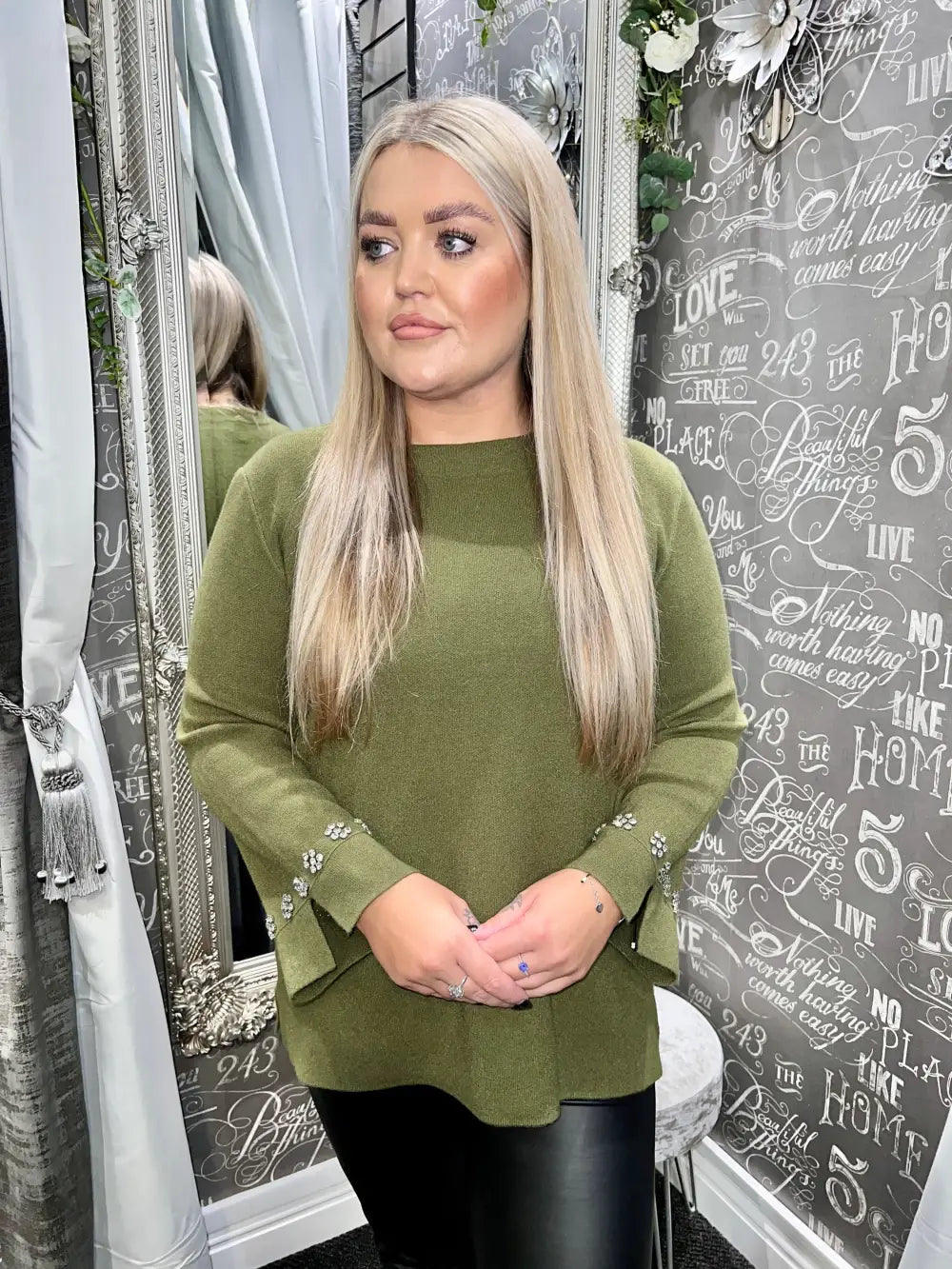 Flora Diamante Flower Sleeve Jumper KHAKI