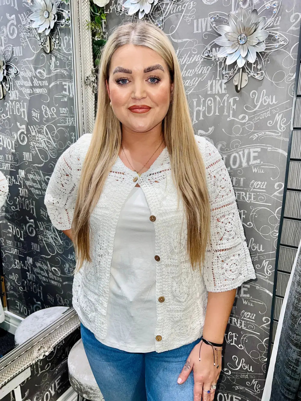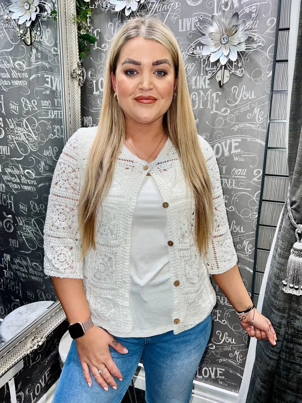 Step into a realm of elegance with our Katya Crochet Cardigan, exquisitely crafted for those who appreciate the finer things in life. This luxurious knit cardi features sumptuous texture and a sophisticated silhouette, highlighted by graceful 3/4 length sleeves that exude timeless charm.