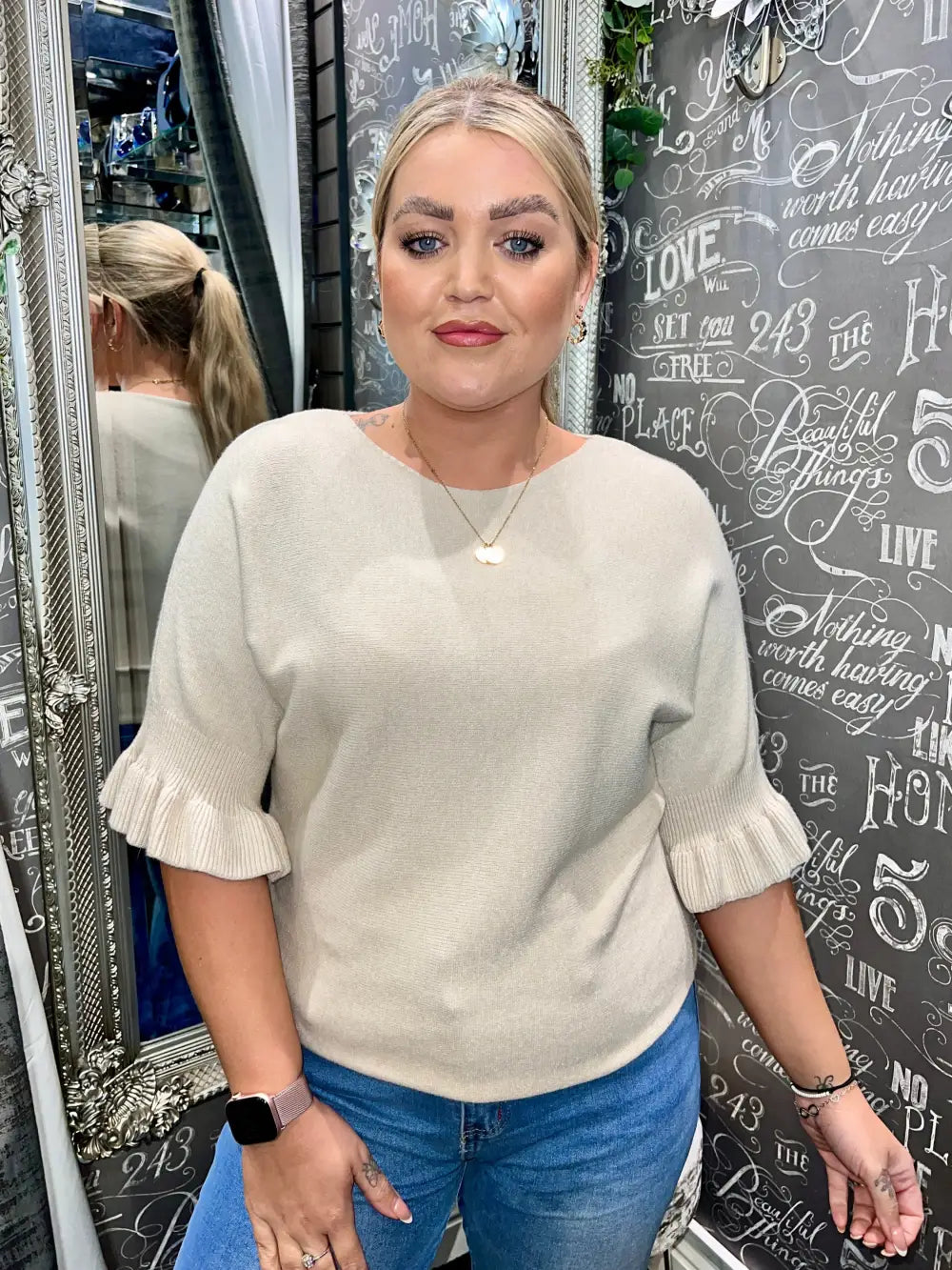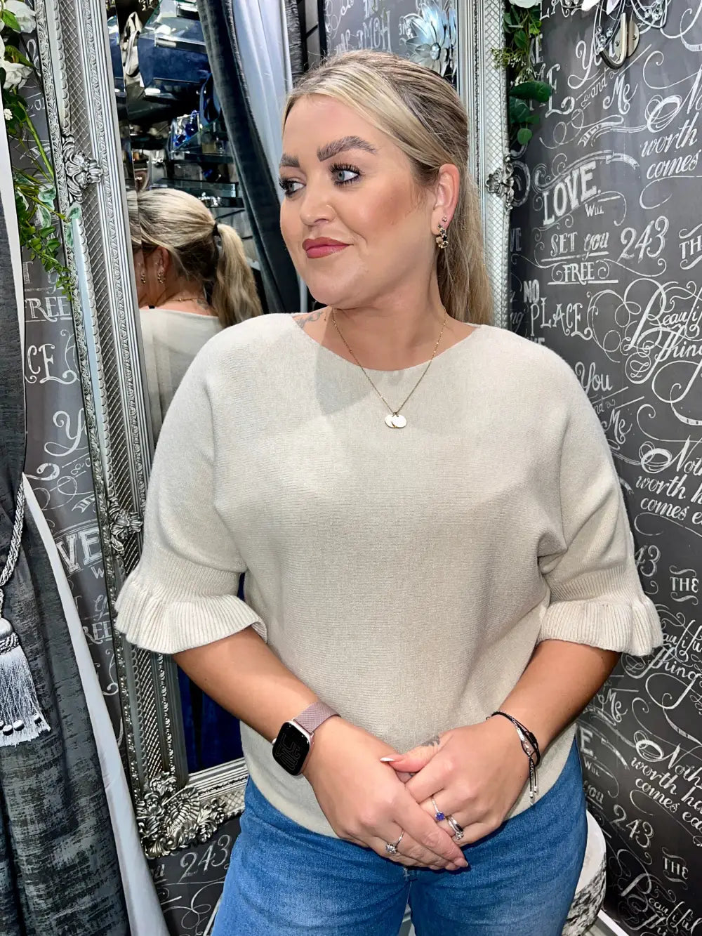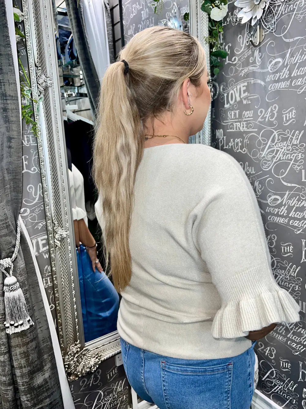 Indulge in the exquisite charm of our Paige Frill Sleeve Knit, a luxurious addition to your wardrobe that elevates any ensemble. Crafted with a soft feel, this sophisticated piece features half-length sleeves finished with a flattering frill cuff, exuding elegance and femininity. The subtle texture of the knit ensures a comfortable fit, making it perfect for both casual outings and more refined occasions.