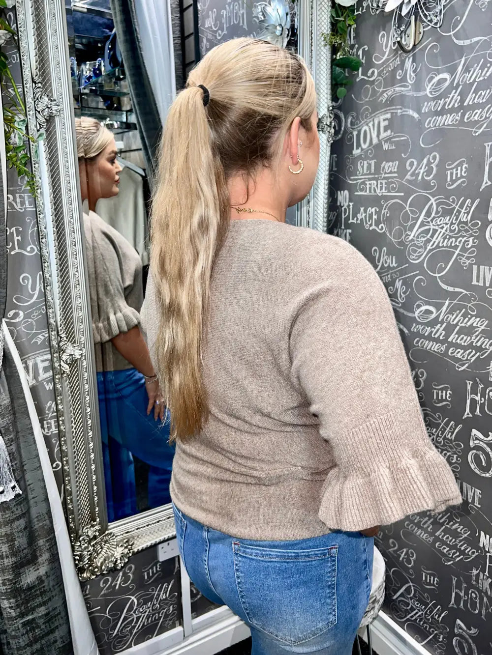 Indulge in the exquisite charm of our Paige Frill Sleeve Knit, a luxurious addition to your wardrobe that elevates any ensemble. Crafted with a soft feel, this sophisticated piece features half-length sleeves finished with a flattering frill cuff, exuding elegance and femininity. The subtle texture of the knit ensures a comfortable fit, making it perfect for both casual outings and more refined occasions.