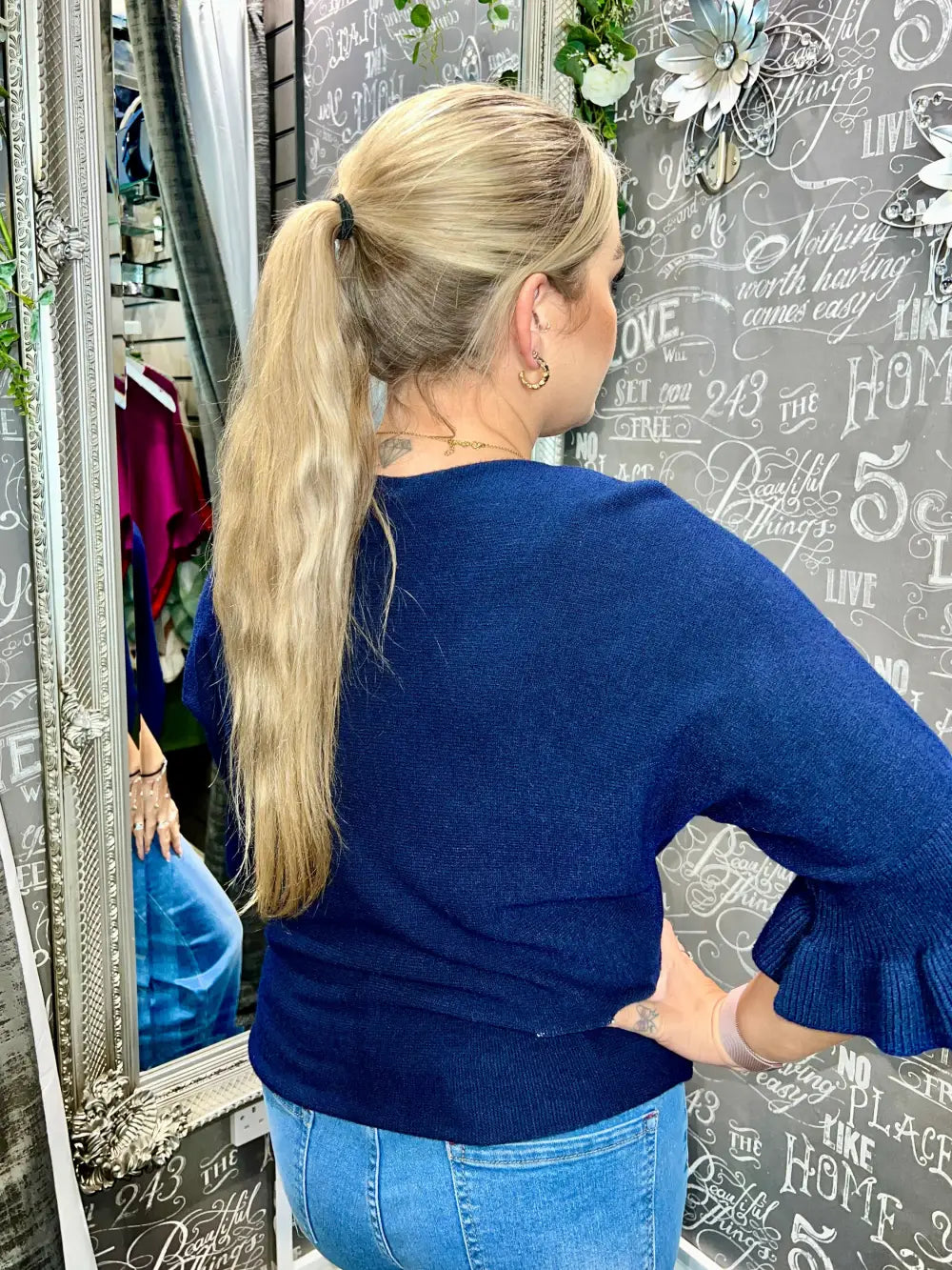 Indulge in the exquisite charm of our Paige Frill Sleeve Knit, a luxurious addition to your wardrobe that elevates any ensemble. Crafted with a soft feel, this sophisticated piece features half-length sleeves finished with a flattering frill cuff, exuding elegance and femininity. The subtle texture of the knit ensures a comfortable fit, making it perfect for both casual outings and more refined occasions.