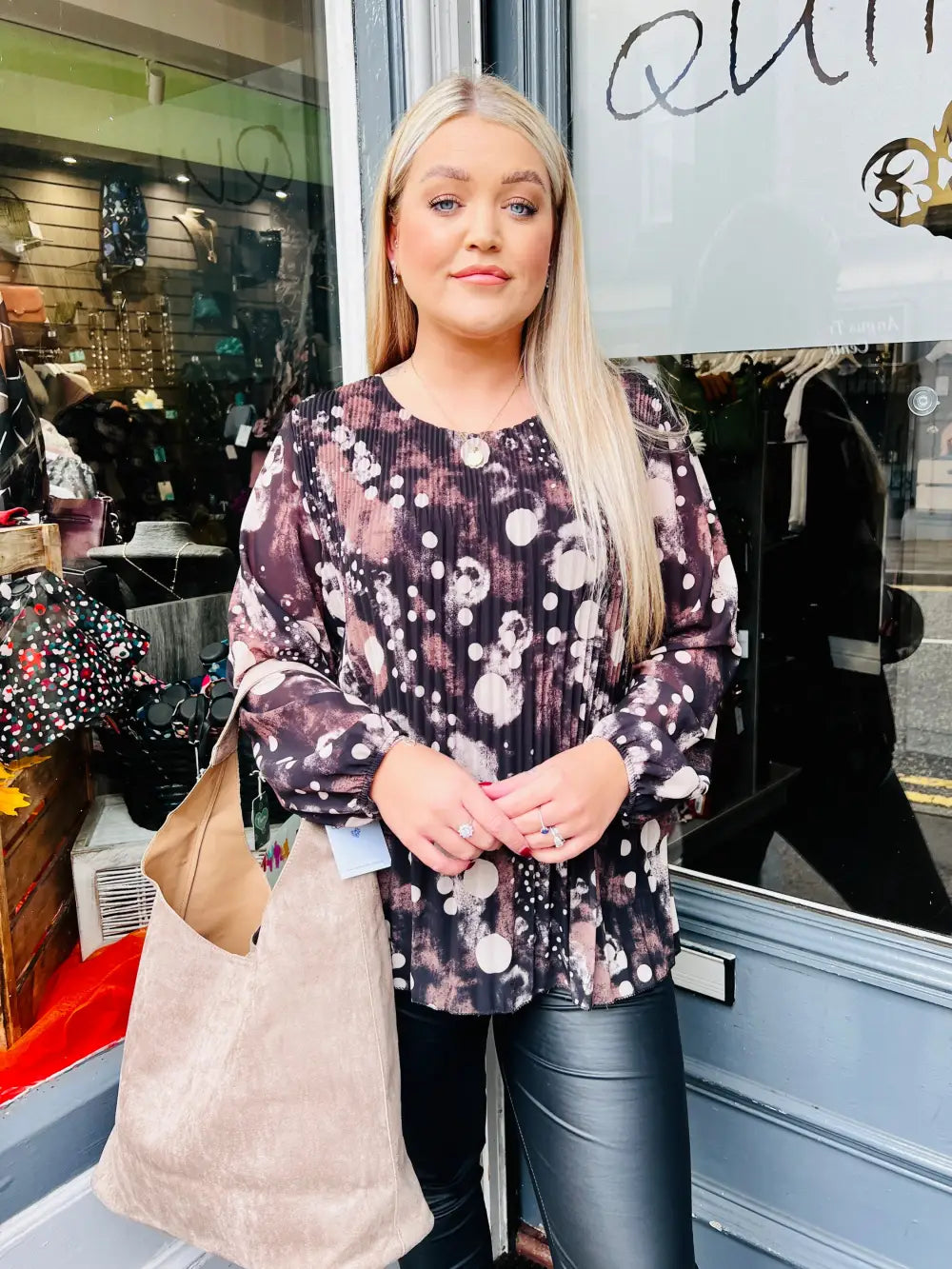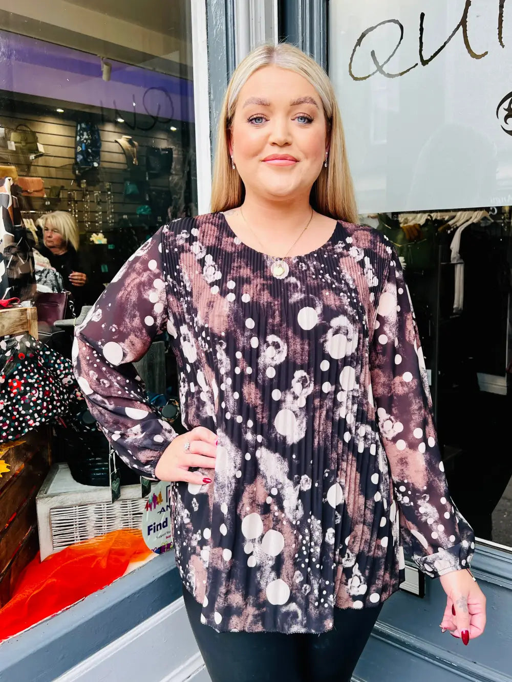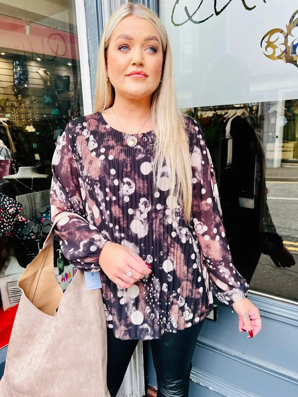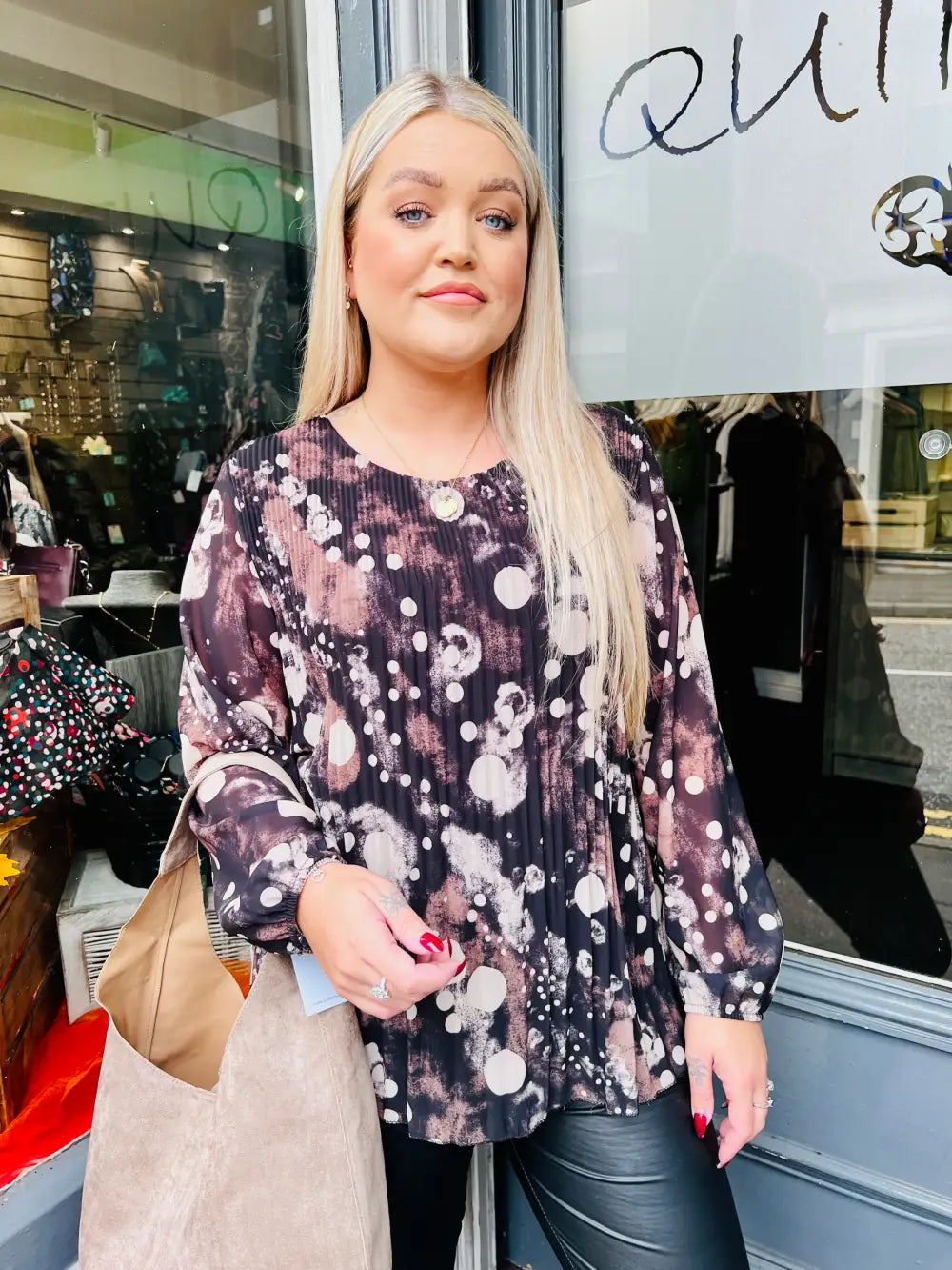 Elevate your wardrobe with the Sasha Chiffon Blouse, a stunning piece that seamlessly combines elegance with contemporary design. This exquisite blouse features a pleated design that adds texture and sophistication, beautifully complemented by a chic circle pattern design that captures attention effortlessly.