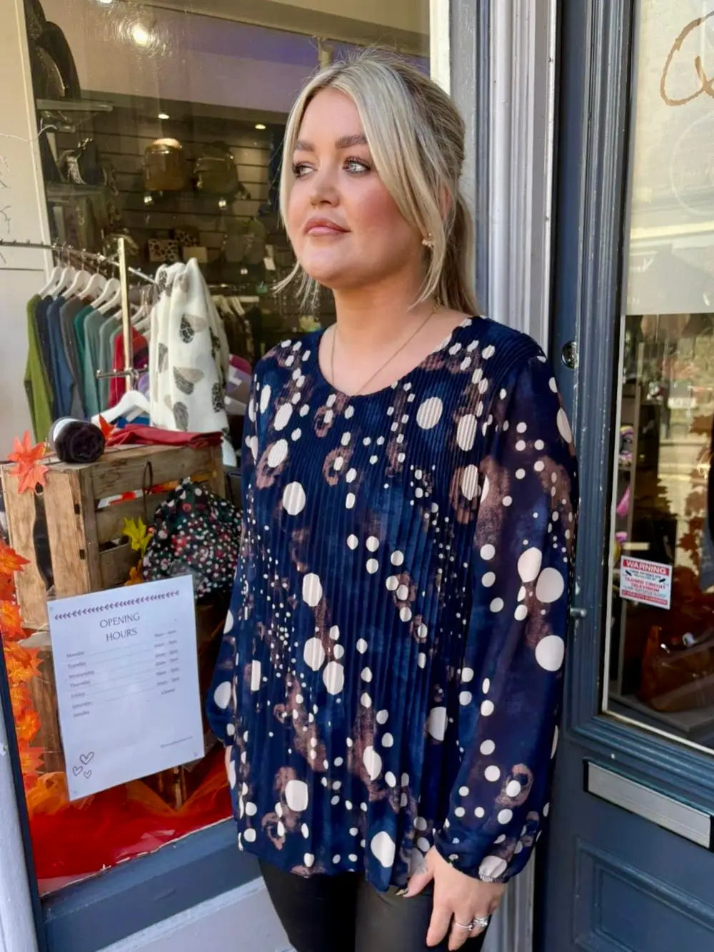 Elevate your wardrobe with the Sasha Chiffon Blouse, a stunning piece that seamlessly combines elegance with contemporary design. This exquisite blouse features a pleated design that adds texture and sophistication, beautifully complemented by a chic circle pattern design that captures attention effortlessly.